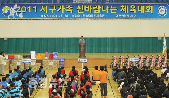 서구(구청장 박환용)는 지난 28 도솔다목적체육관에서 박환용 구청장과 이재선·박병석 국회의원, 구우회 서구의회 의장을 비롯한 구 의원과 공직자 및 가족 등 1,000여명이 참여한 가운데‘2011 서구 가족 신바람 나는 체육대회’를 가졌다.