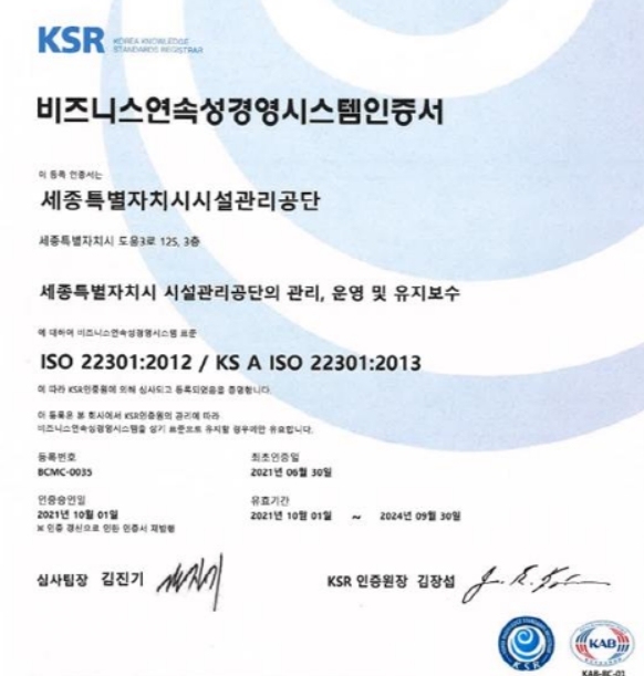 [충청뉴스 최형순 기자] 세종특별자치시시설관리공단(이사장 계용준, 이하 공단)은 ISO22301(비즈니스연속성경영시스템) 인증 유지를 위한 사후심사에서 적합 판정을 받았다.