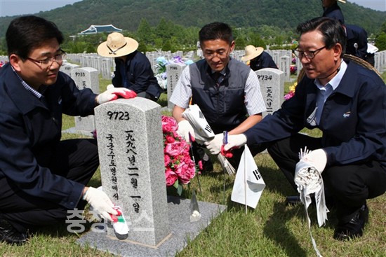 이와관련,공사는 2일 오후 노사 40여명이 합동으로 현충원을 찾아 현충탑을참배한 뒤 순직공무원 묘역과 사병 제1묘역 주변에 태극기 꽂기,묘비닦기,잡초제거등 자원봉사활동을 펼치기도 했다.