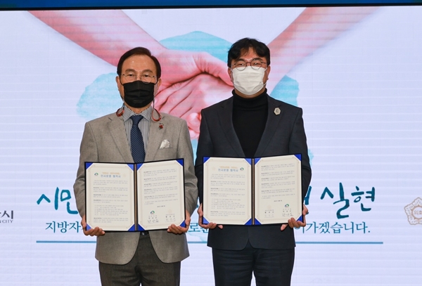 협약서엔 ▲우수 인재 균형배치 위한 인사교류 정례화 ▲의회 공무원 신규채용시험 위탁 ▲프로그램, 운영시설 등 시에서 통합 운영 ▲선택적 복지제도, 후생복지사업 등 시에서 통합 운영 ▲당직 운영, 초과근무 시스템 등 시에서 통합 운영 등 시와 의회가 협력하는 내용이 담겼다.