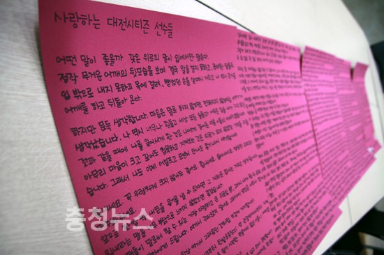 또한 “사랑하는 대전시티즌 선수들”이라는 말로 시작하는 서포터즈들의 편지는 대전시티즌 선수단에게 전하는 진심어린 응원의 메시지가 가득 담겨있었으며 힘든 시기를 거치고 있는 선수들에게 전하는 위로의 말과 함께 더 큰 응원을 약속하는 내용이었다.