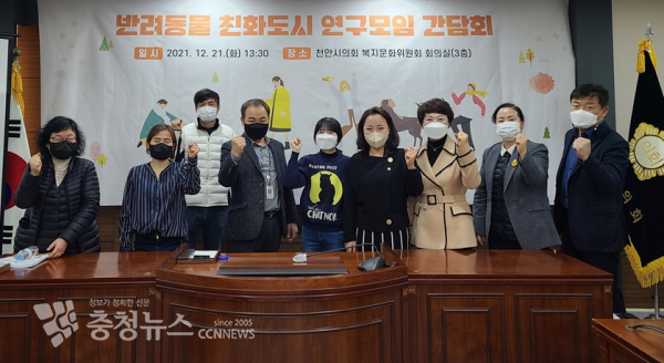 [충청뉴스 최형순 기자] 천안시의회 반려동물 친화도시 연구모임(복아영 대표의원), 황천순, 안미희, 정병인, 김선홍, 김길자, 김행금)은 21일 복지문화위원회 회의실에서 간담회를 개최했다.