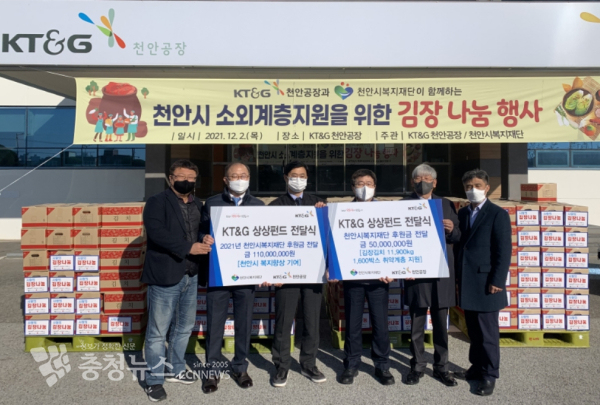 ‘상상펀드 연말 나눔’ 행사는 코로나19와 한파로 힘든 겨울을 보내는 취약계층을 돕기 위해 지역본부, 공장 등 KT&G 전국기관에서 연말까지 진행하는 사회공헌 활동이다.