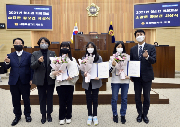 [충청뉴스 최형순 기자] 세종특별자치시의회(의장 이태환)는 22일 본회의장에서 ‘2021년 청소년 의회교실 소감문 공모전’ 시상식을 개최하고 우수작으로 뽑힌 6명에게 상장을 수여했다.