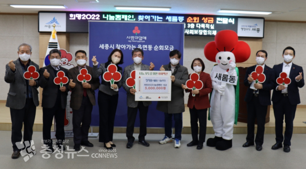 [충청뉴스 최형순 기자] 세종특별자치시 새롬동(동장 김산옥)이 연말연시를 앞두고 새롬동 행정복지센터 3층 다목적실에서 ‘희망2022년 나눔캠페인’ 일환으로 ‘찾아가는 새롬동 순회 모금 전달식’을 진행했다.