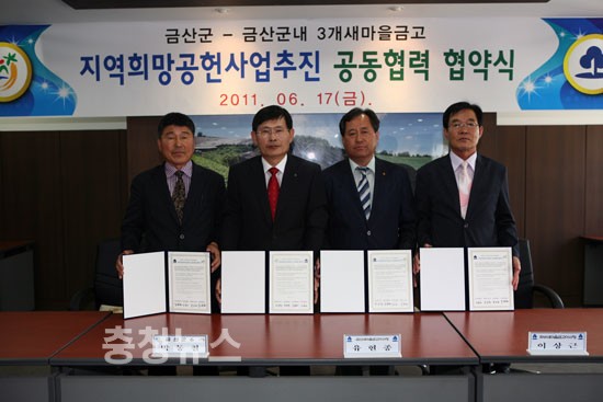 충남 금산군(군수 박동철)은 17일 군청 상황실에서 금산새마을금고, 인삼시장새마을금고, 추부새마을금고와 지역희망공헌사업추진을 위한 공동협약 체결식을 가졌다.