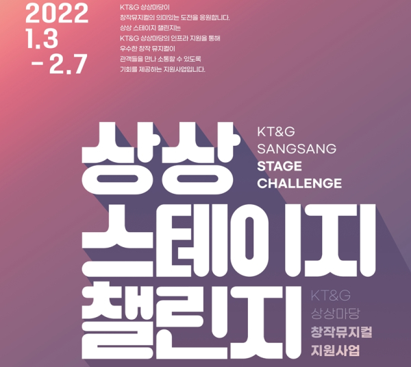 올해로 5회째를 맞는 ‘상상 스테이지 챌린지’는 국내 유수의 창작 뮤지컬 발굴과 지원을 위해 KT&G가 지난 2017년부터 진행해 온 문화공헌 프로그램이다.