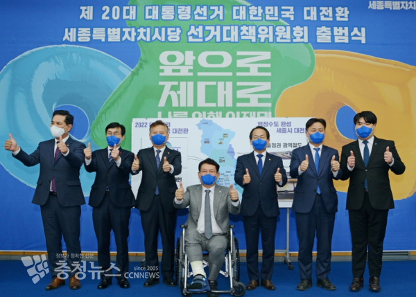 이날 출범식에는 송영길 당대표를 비롯해 김영진 더불어민주당 사무총장, 강준현 세종시당위원장, 홍성국 세종갑 국회의원, 이장섭 충북도당위원장, 박영순 대전시당위원장 및 당직자와 당원 등이 참석해 대선 승리에 대한 필승을 결의했다.