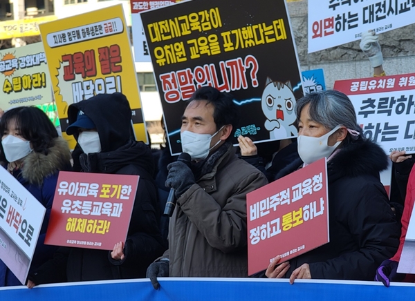 전교조 대전지부는 이날 소속 유치원 교사들과 함께 시교육청 앞에서 기자회견을 열고 “대전지역 2021학년도 국공립유치원 취원율은 19.1%로 전국 꼴찌로 재작년(19.5%)보다도 떨어진 수치”라며 “단위호라동교사가 23명이 줄어들게 되면 사실상 고사 위기에 처한다 해도 과언이 아니다”라고 이같이 밝혔다.