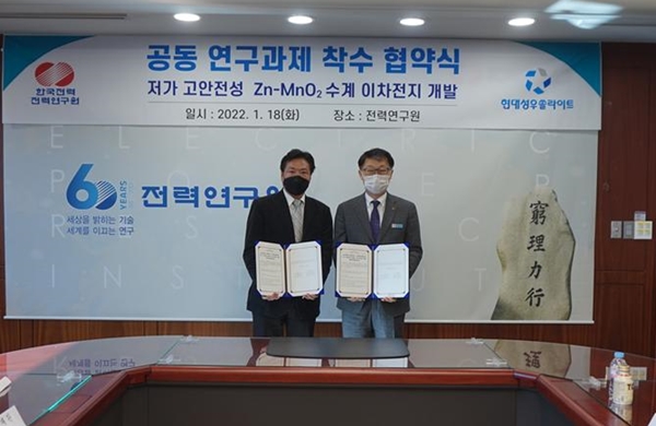 전력연은 현대성우쏠라이트㈜와 ‘저가, 고안전성 망간 기반 수계 이차전지 개발 협력 확대를 위한 공동연구 협약’을 체결했다고 밝혔다.