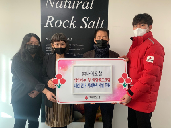 ㈜바이오살(대표 박명금)이 사랑의열매 대전시 사회복지공동모금회에 이웃사랑 물품 암염비누 및 암염골드크림을 기부해 훈훈한 감동을 주고 있다.
