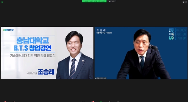 [충청뉴스 이성현 기자] 충남대학교 이노폴리스캠퍼스사업단이 지역의 대표 리더를 초청해 이야기를 듣는 ‘B.T.S(Big boss Talk for Start-Up)’를 진행하고 있는 가운데 조승래 국회의원이 연사로 나서 첨단 기술의 흐름과 기술 패권 시대에 기업가가 가져야 할 마인드를 안내했다.
