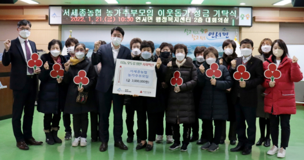 서세종농협 농가주부모임(회장 정만순)은 21일 연서면을 찾아 농산물판매 등 수익사업으로 마련한 성금 300만 원을 어려운 이웃을 위해 써달라며 기탁했다.