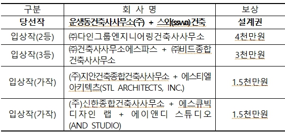 당선작에게는 국립디자인박물관 설계권이 주어지고, 나머지 4개의 입상작에게는 총 상금 1억 원이 보상금으로 차등 지급된다. 향후 당선작과 입상작은 행복청 누리집과 사이버 전시관에 공개 할 예정이다.