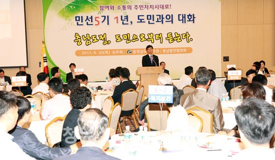 충남도(도지사 안희정)는 민선5기 출범 1년을 맞아 30일 부여 롯데리조트에서 도민으로부터 직접 듣고 정책 방향을 세우기 위한‘도민과의 대화’를 개최했다.