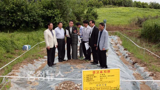 충청남도의회(의장 유병기) 농수산경제위원회(위원장 강철민)는 지난 1일 천안시 수신면 신풍리에 위치한 구제역 가축 매몰지 현장을 방문해 장마철 집중호우로 인한 토지유실, 침출수 유출 위험은 없는지 집중 점검했다.