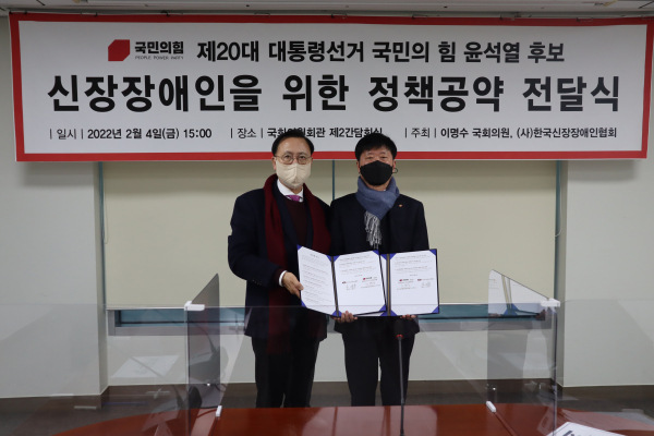 [충청뉴스 박동혁 기자] 국민의힘 선거대책위원회(이하 선대위)와 (사)한국신장장애인협회는 4일 오후 국회의원회관 제2간담회실에서 '신장장애인을 위한 정책제안 전달식'을 공동 개최했다.