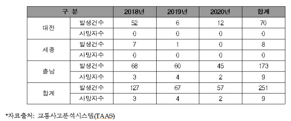 최근 3년간 사고발생 지역을 살펴보면, 대전에서는 유성구가 26건의 사고가 발생하며 최다 발생 지역으로 집계되었고, 충남에서는 천안시(29건), 당진시(25건)가 최다 발생 지역으로 꼽혔다. 그 뒤로는 공주시, 서산시(각각 18건)가 그 뒤를 이었다.