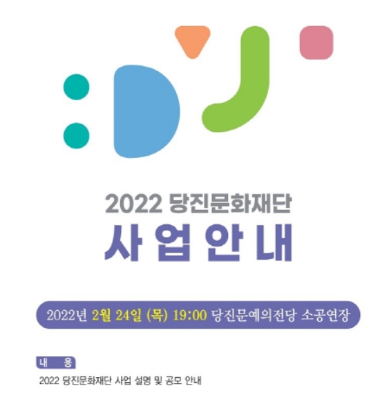 [충청뉴스 최형순 기자] (재)당진문화재단은 오는 24일(목) 오후 7시부터 당진문예의전당 소공연장에서 ‘2022 당진문화재단 사업설명회’와 ‘당진문화진흥공모사업 설명회’를 함께 개최한다.