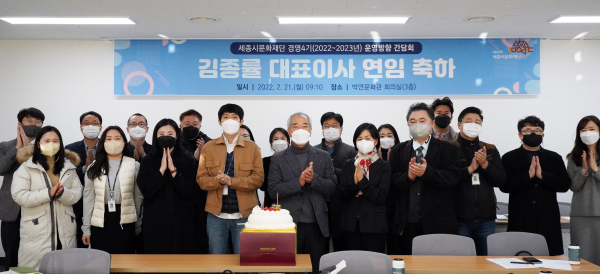 [충청뉴스 최형순 기자] 세종시문화재단(이사장 이춘희)은 김종률 대표이사가 20일 연임되었다.임기는 2022년 2월 20일부터 2024년 2월 19일까지 2년이다.