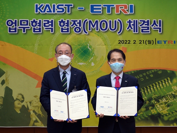 한국전자통신연구원(ETRI)과 한국과학기술원(KAIST)은 미래 새로운 성장동력인 ‘뉴프런티어 기술’ 공동연구, 상호 인력교류, 글로벌 역량 확보 등의 내용을 담은 업무협력 협정서(MOU)를 체결했다고 22일 밝혔다.