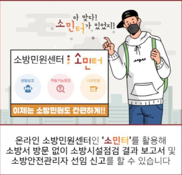 안재영 소방특별조사팀장은 “코로나19 확산 및 개인 사정상 직접 방문하기 어려우신 분들은 빠르고 편리한 소민터를 적극 이용해 주시기 바란다”고 전했다.