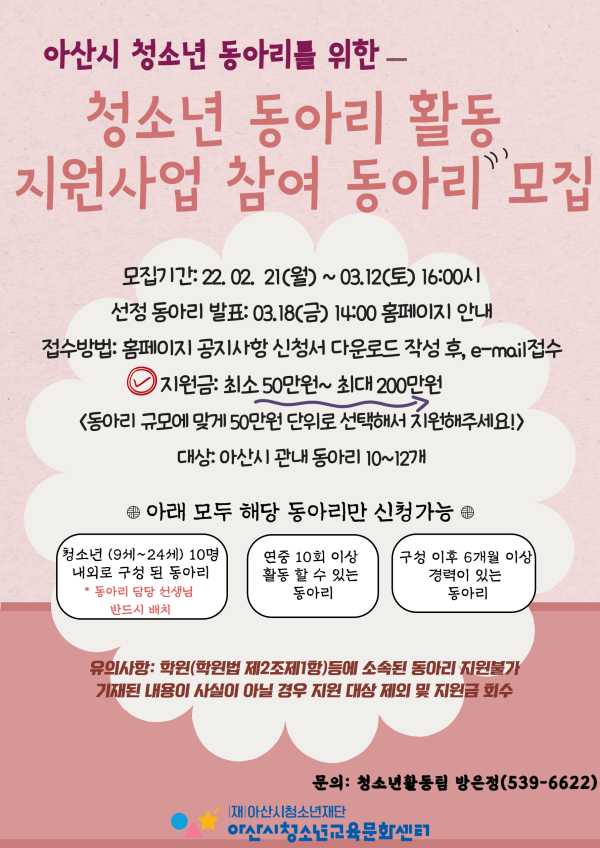 이번 사업은 아산시 소속 청소년(9~24세) 10명 내외로 구성돼 있고, 연중 10회 이상 활동할 수 있으며, 구성 이후 6개월 이상 경력이 있는 동아리라면 지원가능하다.