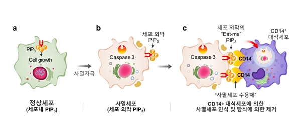 연구팀은 이번 연구에서 세포 내 다양한 신호전달에 중요한 인지질로 알려진 포스파티딜이노시톨 포스페이트(PI(3,4,5)P3)가 세포사멸시 세포 밖으로 노출되면서 ‘eat-me’신호로 작용한다는 것을 밝혔다.