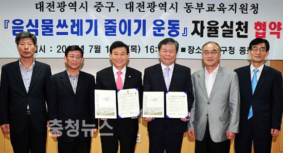 대전 중구(구청장 박용갑)는 14일 음식물쓰레기 줄이기 실천을 생활화하고 낭비적 음식문화를 바꾸기 위해 동부교육지원청과 ‘음식물쓰레기 줄이기 자율실천 협약’을 중회의실에서 체결했다.