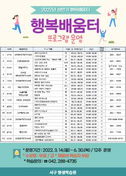 [충청뉴스 김남숙 기자] 대전 서구는 '2022년 상반기 행복배움터‘ 프로그램 학습자 모집에 이어 선정된 마을배움터 별 프로그램 운영이 이달 14일부터 들어간다고 10일 밝혔다.
