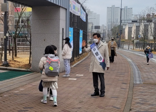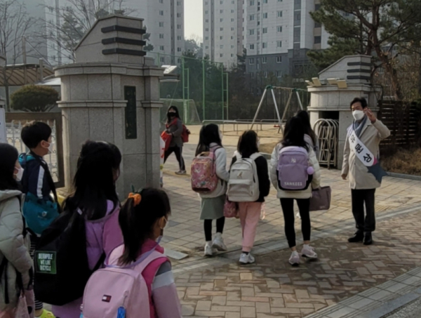 [충청뉴스 최형순 기자] 유문상 세종시교육감 예비후보가 16일 아름초등학교를 방문하여 학생들과 등교인사를 나누고 학생들 교통안전지도를 했다.