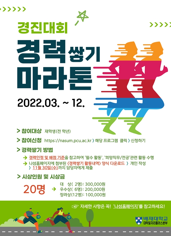 배재대 대학일자리플러스본부은 3~12월 재학생 대상 ‘경력쌓기 마라톤&경진대회’를 연다. 이 프로그램은 △청년 고용정책 참여 △자격증 취득 △취업 동아리 활동 △공모전, 경진대회 참여 △일경험(현장실습) 등 진로·취업역량을 강화하는 9개 영역을 평가한다.