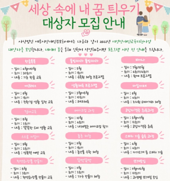 현재 세종시에 거주하는 등록된 여성장애인이라면 누구나 무료로 참여 가능하다.
