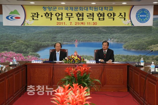 충남 청양군(군수 이석화)이 지역사회 발전을 도모하기 위해 군청 상황실에서 이석화 청양군수, 오치선 총장을 비롯해 군청 실과장, 학교 관계자가 참석한 가운데 21일 국제문화대학원대학교와 업무협약을 체결했다.