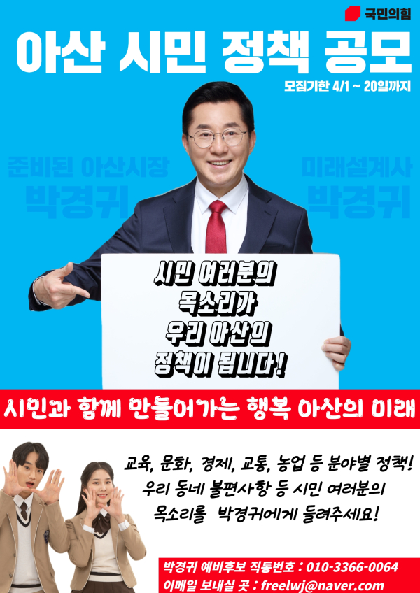 [충청뉴스 최형순 박동혁 기자] 국민의힘 박경귀 아산시장 예비후보가 "‘시민과의 소통’을 강조하며 내달 1일부터 20일까지 시민들을 대상으로 아산시 발전 정책을 공개 모집한다"고 29일 밝혔다.