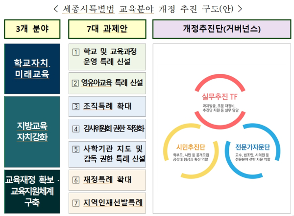 시교육청은 세종시법 교육분야 개정이 갖는 의미와 중요도를 인식하고 교육특례가 보다 촘촘히 반영되도록 민관학 거버넌스를 구축해 철저히 추진할 방침이다.