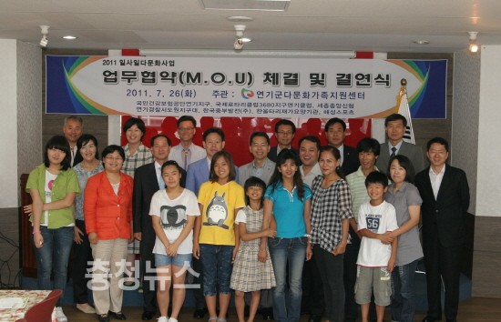 연기군(군수 유한식)은 7월 26일 다문화 가족지원센터(센터장 하미용)에서 지역내 7개 기관과 다문화 5가정이 ‘2011 일사일다문화사업’ 업무협약(MOU)체결 및 결연식을 가졌다.