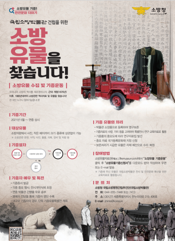 이번 소방 유물 수집 및 기증 운동은 2024년 개관 예정인 국립소방박물관에 전시할 역사적 자료와 유물을 보존하기 위해 추진되고 있다.