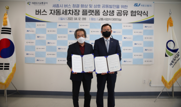 [충청뉴스 최형순 기자] 세종도시교통공사(사장 배준석)와 세종교통주식회사(대표 이창덕)는 12일 오후5시 대평동에 위치한 공사 첨단BRT차고지 2층 대회의실에서 ‘세종시 버스 청결 향상 및 지역 상호 공동발전을 위한 버스 자동세차장 플랫폼 상생 공유 업무협약’을 체결했다.