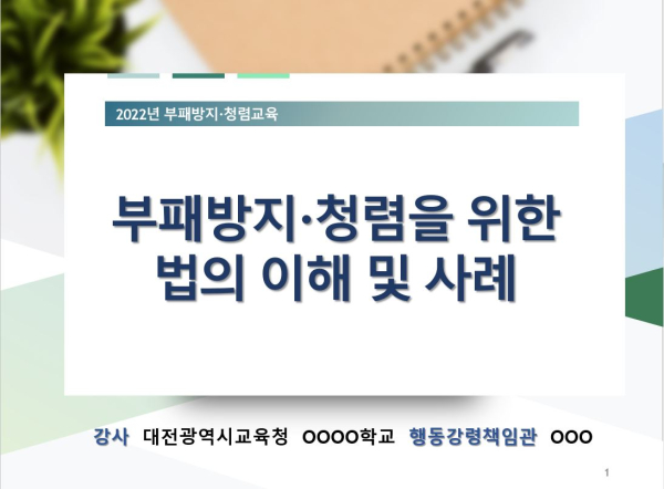 부패방지청렴교육 표준교육자료는 청렴연수원에서 제공한 교육자료를 중심으로 행동강령책임관이 교직원 대상 자체교육 실시에 적극 활용 할 수 있는 맞춤형 필수 내용 위주로 재구성해 교육수요자의 이해를 돕는 연수자료를 제공하였다.