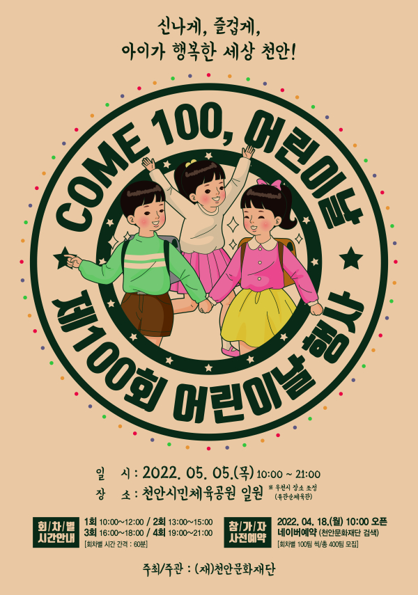 [충청뉴스 박동혁 기자] 천안문화재단은 "제100회 어린이날을 맞아 ‘신나게, 즐겁게, 아이가 행복한 세상 천안!’을 주제로 온·오프라인 어린이날 기념행사를 개최한다"고 15일 밝혔다.
