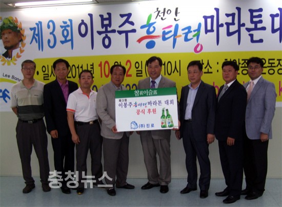 (주)진로는 ‘제3회 이봉주 천안흥타령 마라톤대회’의 성공적인 개최를 위해 지난 2일 대회조직위원회 사무국에서 조직위원장을 비롯한 조직위관계자들과 (주)진로 천안지점(지점장 장주호) 관계자들이 참석한 가운데 협약식을 가졌다.