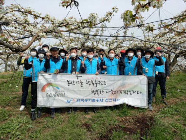 천기협 회원들과 농어촌공사 천안지사 임·직원들은 배 꽃이 본격적으로 개화함에도, 해외노동자 및 자원봉사자가 줄어 일손을 구하기 어려운 농가를 돕기 위해 3년째 화접 봉사에 참여하고 있다.