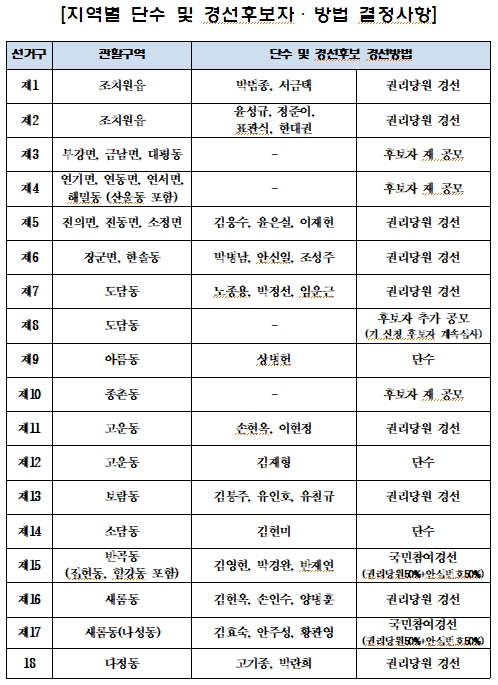 총 18개 지역을 심사한 가운데, 단수 지역은 3곳, 경선 지역은 11곳, 후보자 추가 및 재공모 지역 4곳으로 결정 했다. 후보자 추가 공모 지역은 신청후보자의 본선경쟁력 등 자격심사를 고려한 결과 적합한 후보가 없어 추가 및 재모집을 결정하게 되었다.