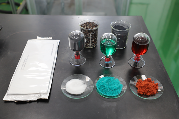 폐배터리셀(왼쪽)에서 분리 추출한 탄산리튬(흰색), 황산니켈(청록색), 황산코발트(붉은색) 원료.