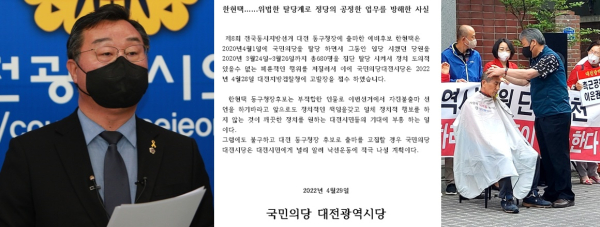 대전시의원 중구 제1 선거구 공천을 신청했다 컷오프 된 전동생 예비후보는 이날 오후 시당 앞에서 “불합리한 특정 후보의 단수공천을 철회하라. 공정하게 경선하라”며 강력 반발했다. 이후 단수 공천에 대한 항의 표시로 삭발을 했다. 그러나 시당 공천관리위원회는 전 예비후보의 재심 신청을 기각했다.