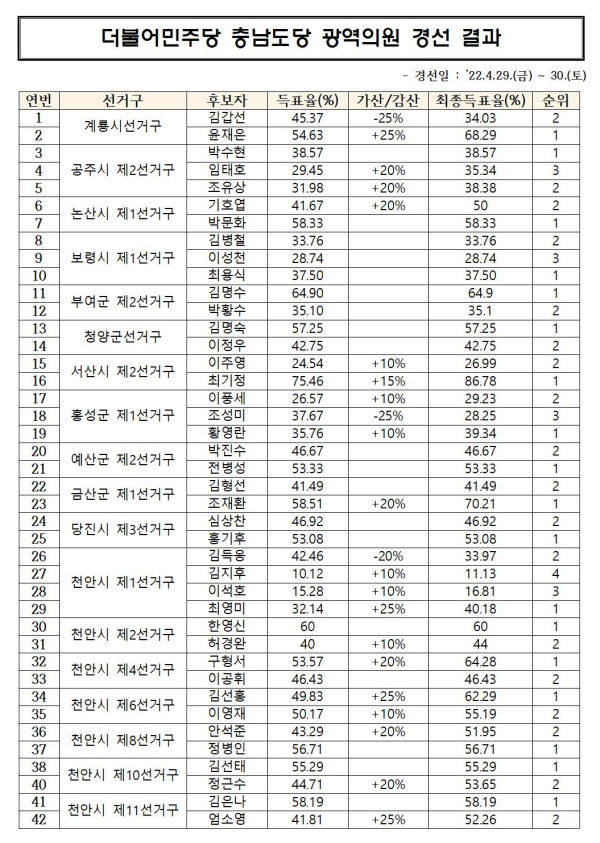 [충청뉴스 박동혁 기자] 더불어민주당 충남도당 선거관리위원회(이하 선관위)는 1일 제8회 전국동시지방선거 충남 광역의원 선거구의 경선(4월 29~30일) 결과를 발표했다.