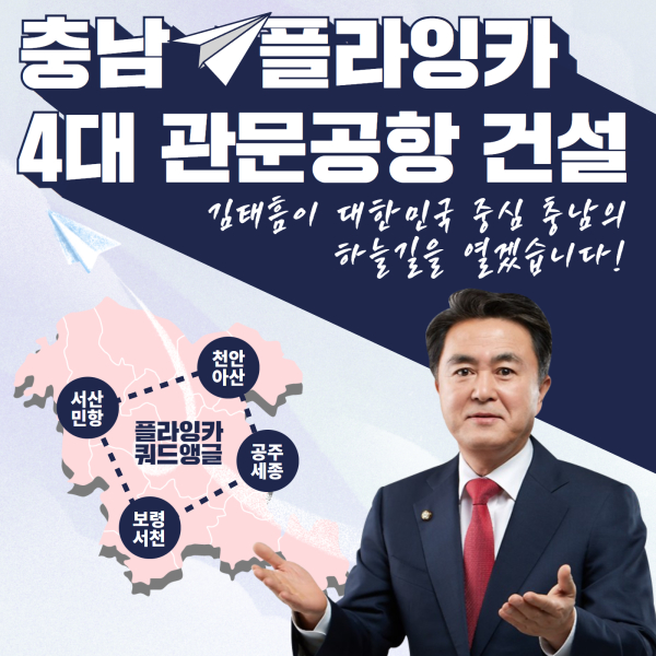 [충청뉴스 김거수 기자] 국민의힘 김태흠 충남지사 후보는 충남에 플라잉카 4대 관문공항을 건설하겠다고 3일 선언했다.