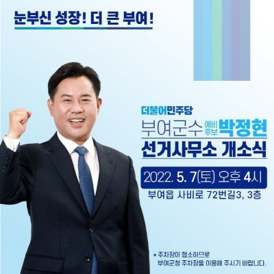 [충청뉴스 부여 = 조홍기 기자] 박정현 부여군수 후보자 선거사무소 개소식이 오는 7일(토) 오후 4시 부여읍 사비로 72번길 3, 3층에 마련된 선거사무소에서 열린다.