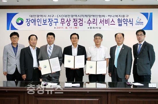 대전 서구가 11일 대회의실에서 박환용 서구청장, 윤석연 대전광역시지체장애인협회장, 이병주 하나복지용구 대표가 참석한 가운데 ‘장애인보장구 무상 점검 수리 서비스 협약’을 체결하고, 장애인 사회 참여 기회 확대와 이동권 확보에 나섰다.
